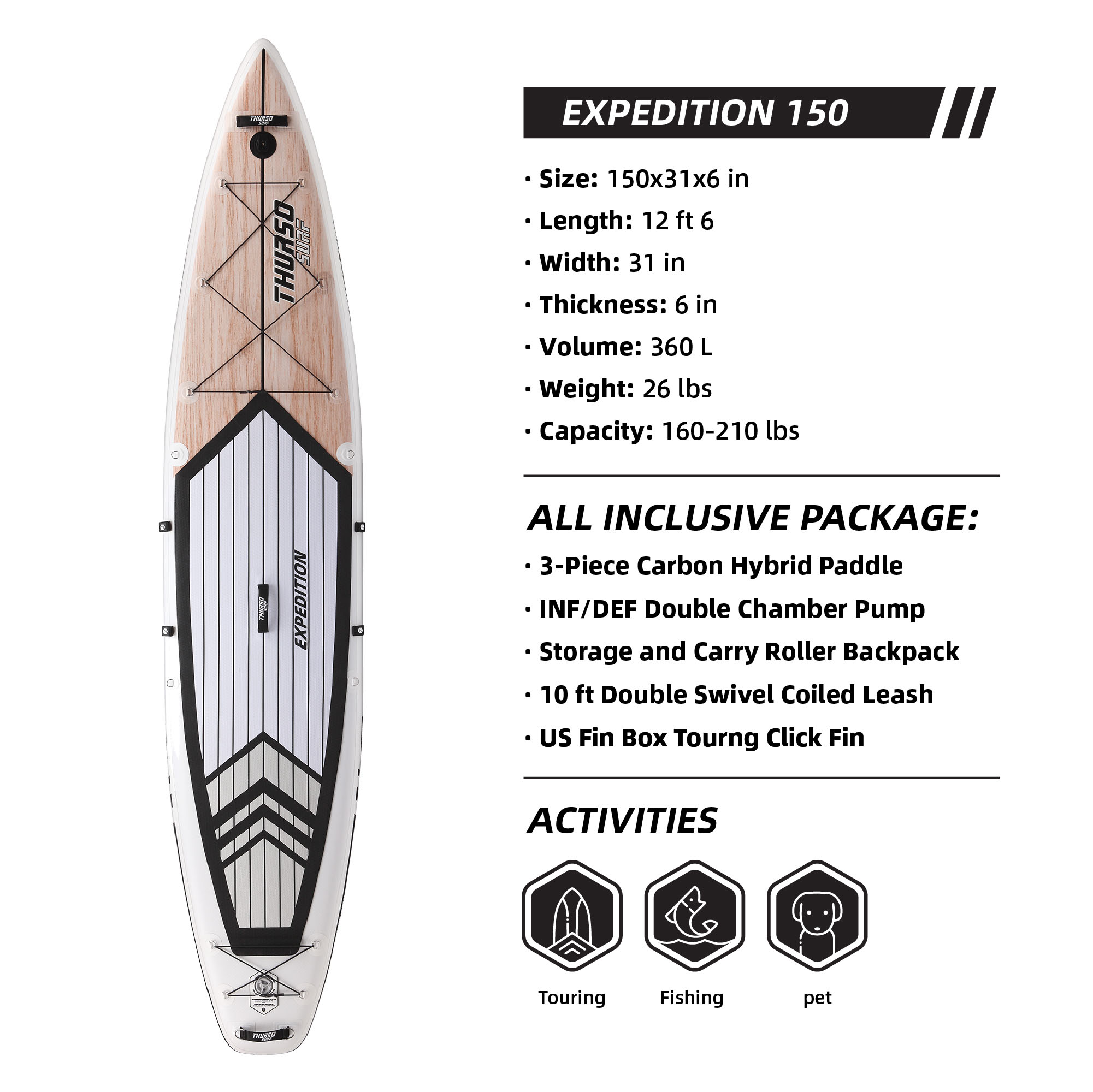 Built with long distance paddling in mind, the Expedition 150 Touring paddle board is shaped like a spearpoint. Long and narrow, its glide and tracking are superior making it notably faster than other boards. Its pointed nose pierces through chop to keep you flying straight toward your target without losing speed. While it’s narrow relative to its length, the higher displacement of the Expedition paddle board makes it surprisingly forgiving as conditions become more challenging. For a 12‘6 paddle board this long, carbon enhanced rails are a must. They run the length of the racing paddle board ensuring rigidity beyond the capability of other inflatables giving you greater glide with every stroke and hardboard-like performance. If your aim is to go far, there’s no better choice.