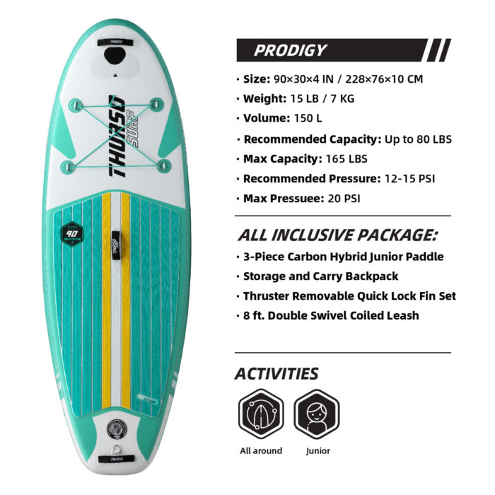 To keep up and stay safe on family paddles, kids need a board designed specifically for young paddlers, not a water toy. The junior paddle board specifically designed with young paddlers in mind. Perfect for kids from 5yr old and beyond, this kids paddle board combines the stability needed for beginners with the maneuverability that smaller paddlers require. Unlike generic water toys, the Prodigy Junior stand up paddle board is constructed to the same high standards of quality and safety as our full-sized boards, ensuring a safe and enjoyable experience on the water.Its all-around shape is extra wide in the middle for the stability new paddlers need, and tapered at the tail so it’s easy to maneuver and fun to ride. It comes with an adjustable paddle that’s the right fit for smaller limbs and it’s easy to transport in its own carry bag.