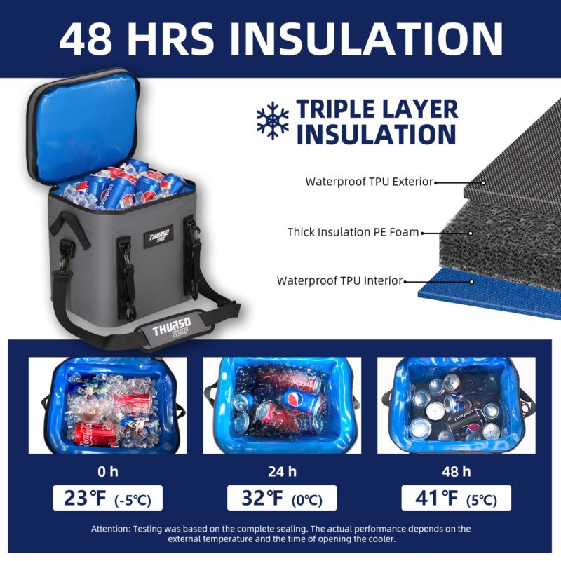 THURSO SURF soft cooler adopted advanced insulation technology, featuring thick closed-cell foam, ensures that the temperature inside the bag remains stable for up to 48 hours, keeping your items fresh and cold. Whether you’re going on a weekend camping trip or spending a day at the beach, our soft side cooler is the perfect companion to keep your food and drinks at the perfect temperature.